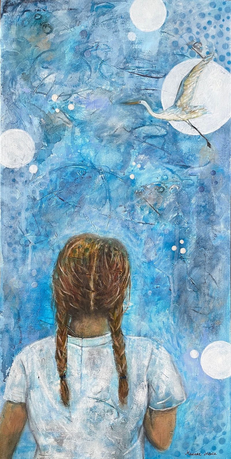 “Rather Play Outside” by local artist Marieke Mertz is an original oil painting with mixed media on 15” x 30” gallery wrapped canvas